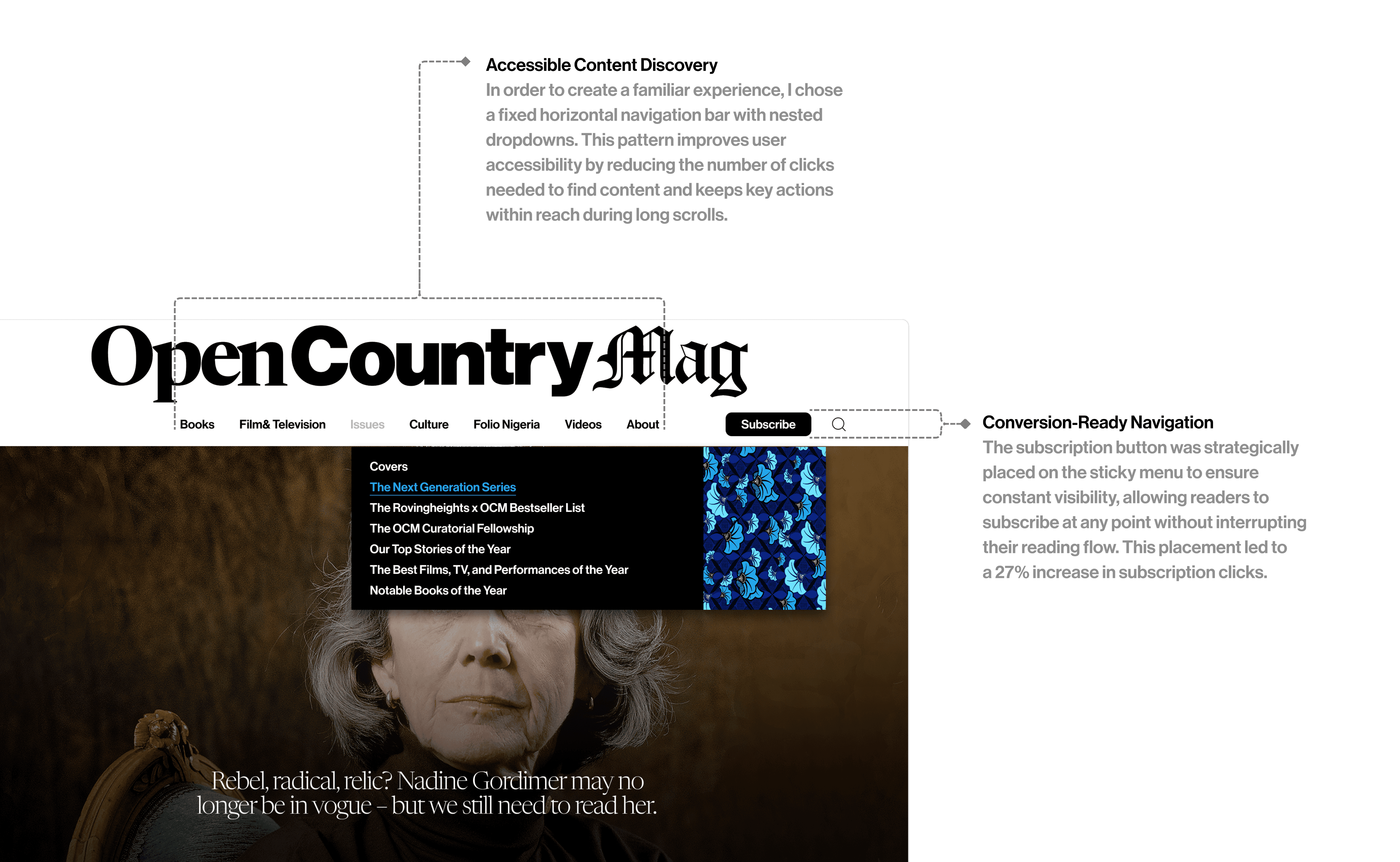 This case study shares my role as the sole UX designer at a digital publishing startup, where I redesigned an underperforming digital magazine website into a scalable platform for its growing audience. It highlights tools and processes applied to improve engagement and expand readership through the redesign of Open Country Mag homepage.